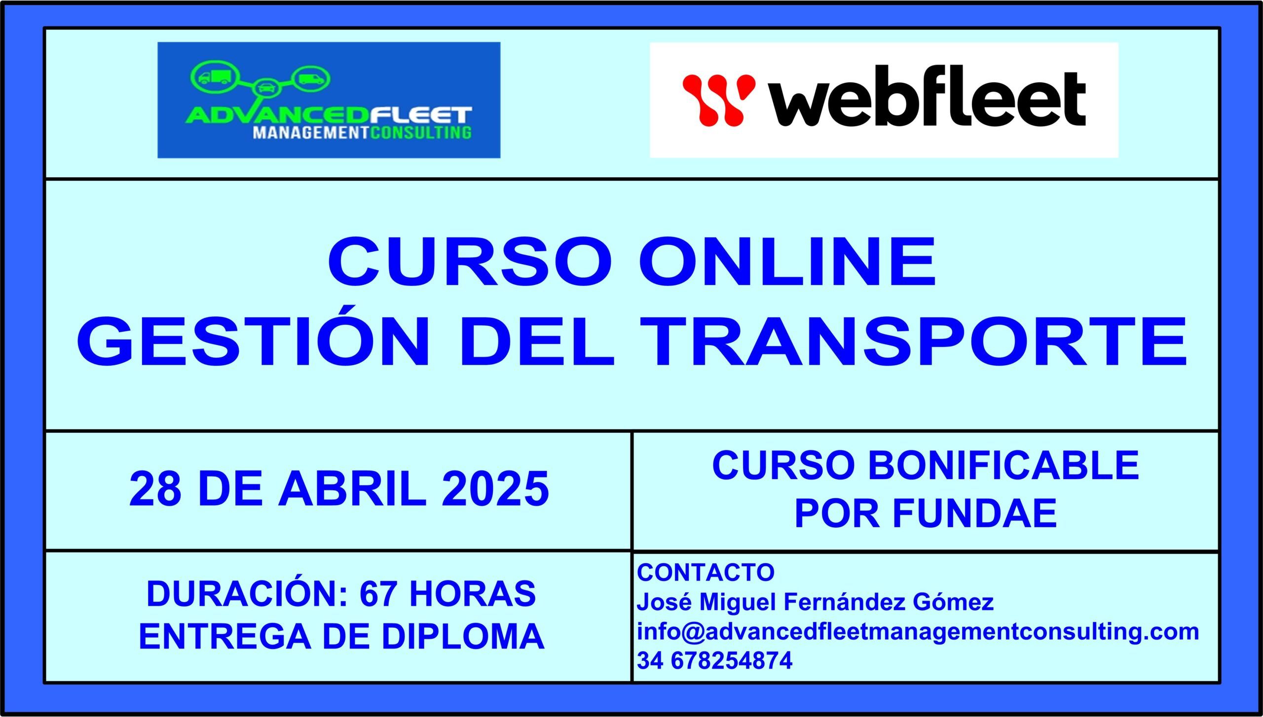 José Miguel Fernández Gómez (LinkeDIn) es el manager de Advanced Fleet Management Consulting, compañía Española consultora especializada en gestión de flotas de vehículos. Con este curso quiero poner a disposición de mis clientes mi experiencia y el conocimiento adquirido durante mi carrera laboral y académica en esta disciplina.