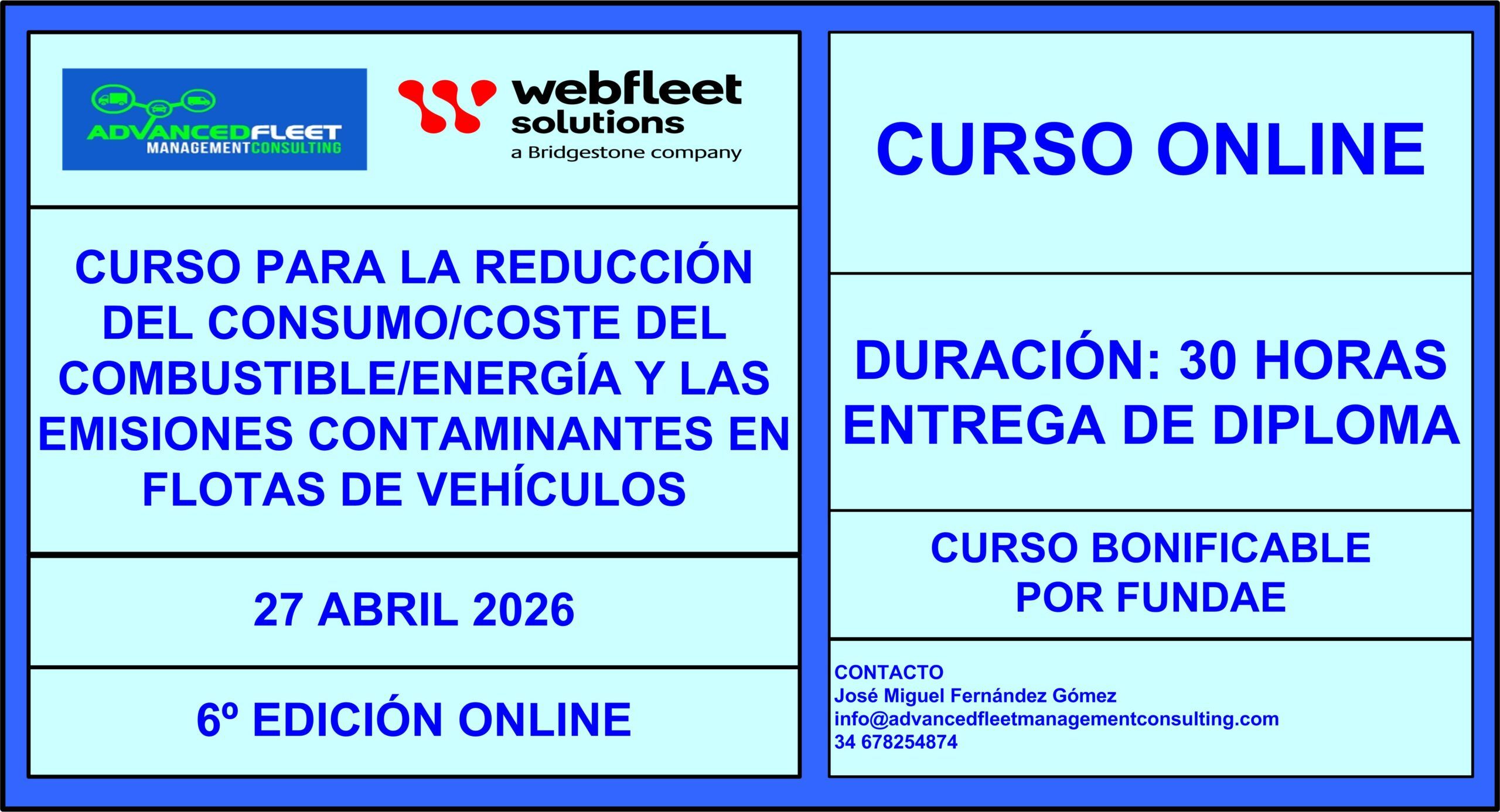 Advanced Fleet Management Consulting, y las compañías colaboradoras organizan el “Curso para la reducción del consumo/coste del combustible y las emisiones contaminantes en flotas de vehículos” con el fin de formar a los profesionales en gestión de flotas a adquirir los conocimientos apropiados para la implementación del programa de reducción del consumo de combustible y las emisiones contaminantes en una flota de vehículos, y reducir entre un 15-20% del consumo de combustible y las emisiones contaminantes. .