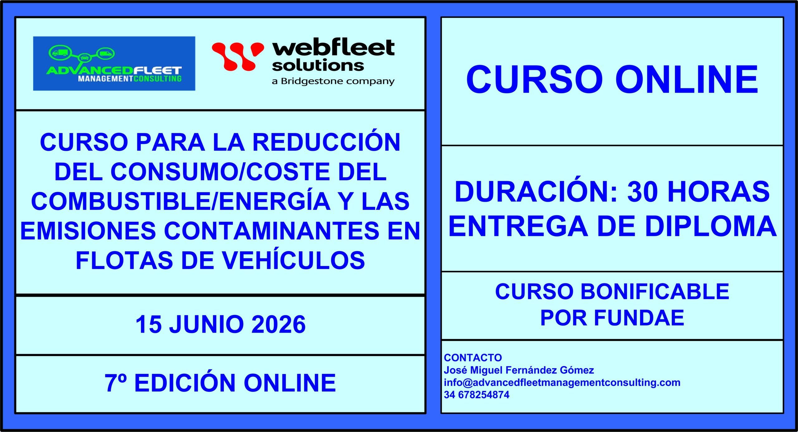 Advanced Fleet Management Consulting, y las compañías colaboradoras organizan el “Curso para la reducción del consumo/coste del combustible y las emisiones contaminantes en flotas de vehículos” con el fin de formar a los profesionales en gestión de flotas a adquirir los conocimientos apropiados para la implementación del programa de reducción del consumo de combustible y las emisiones contaminantes en una flota de vehículos, y reducir entre un 15-20% del consumo de combustible y las emisiones contaminantes. .